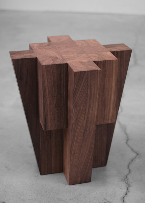 Made in American Walnut the Bunker Side Table is the latest addition to the collection of Belgian designer Arno de Clercq. For those who are not familiar with his work, Arno’s first collection has come to the idea that there are too few interiors where they no longer have the big and static vases and candlesticks that the people had in big houses over 100 years ago. By focusing on architecture, ancient arts and design, after war buildings, defence buildings (bunkers and fortresses) and tribal arts, he created a collection that has been found in international galleries and shops.With each piece being unique and entirely handcrafted at his amazing atelier in Zaventem the collection expanded over the years, showing new furniture pieces and objects in different wood and bronze.