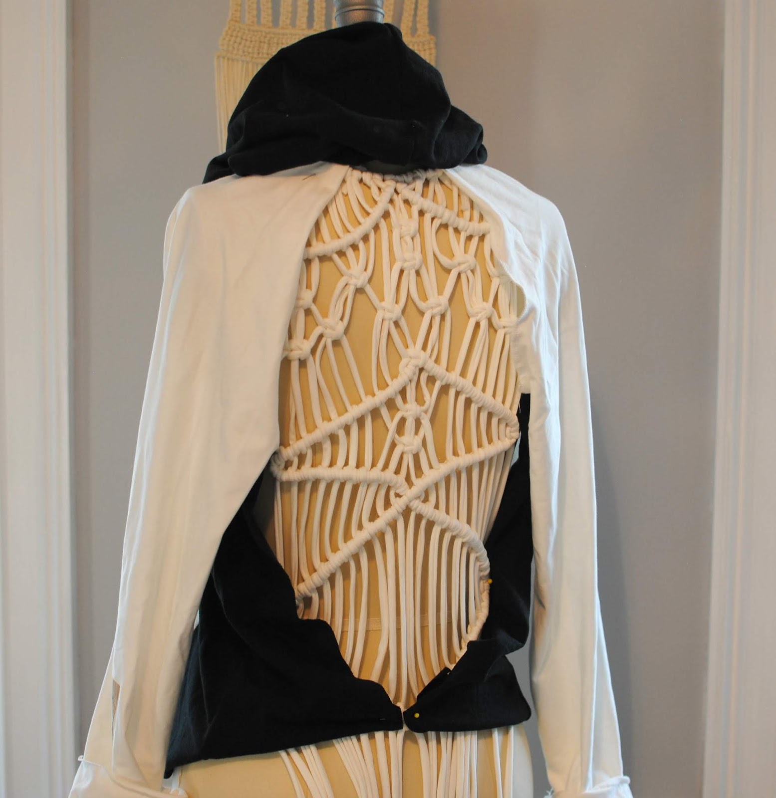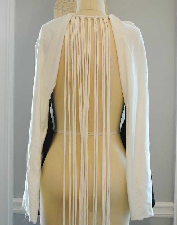 I love how it turned out and it feels cool (literally and figuratively). For the fabric I used Stylish Fabrics Cotton Jersey Knit in black and white. I love the weight and feel to this cotton jersey. It has a nice medium weight but soft to the touch which is perfect for hoodies or long sleeve tops. I used it for the cording as well. I cut it into strips using my rotary cutter. I then pulled the strips to create string and knotted them together. I didn’t really have a plan for the macrame pattern I honesty just started knotting it and came up with this.