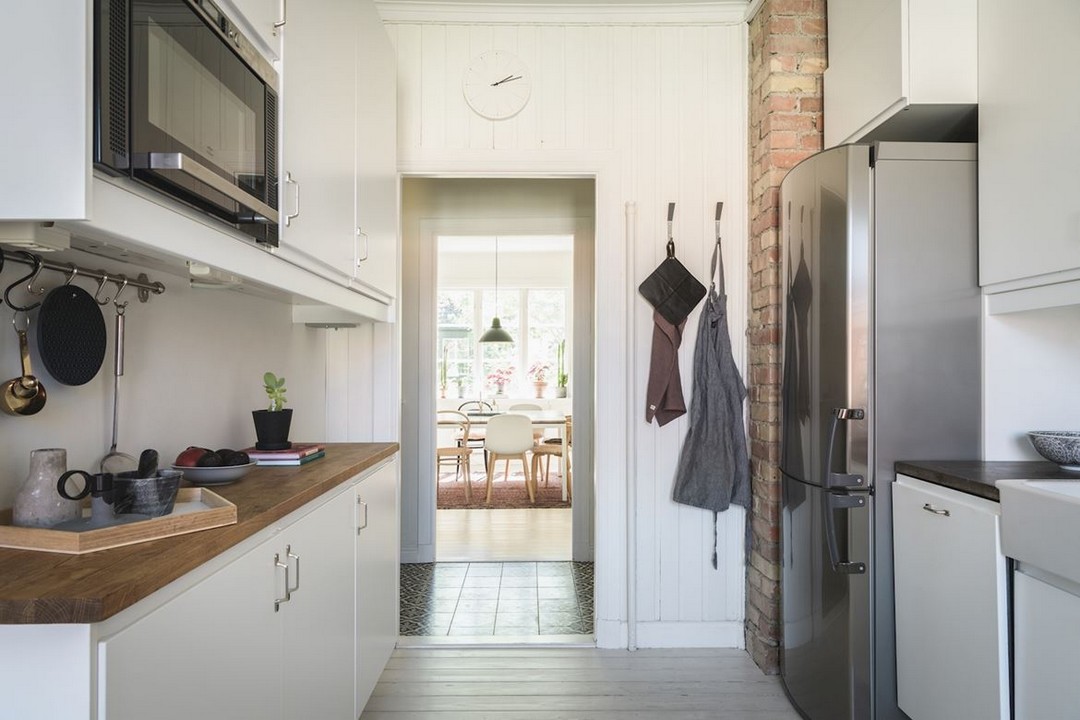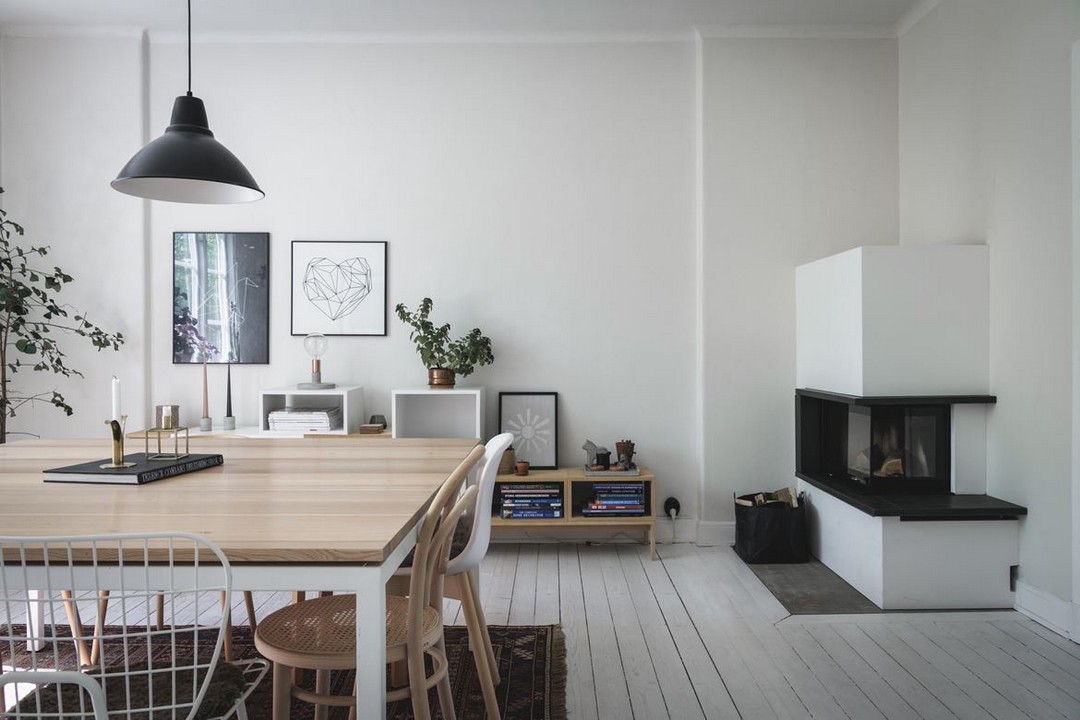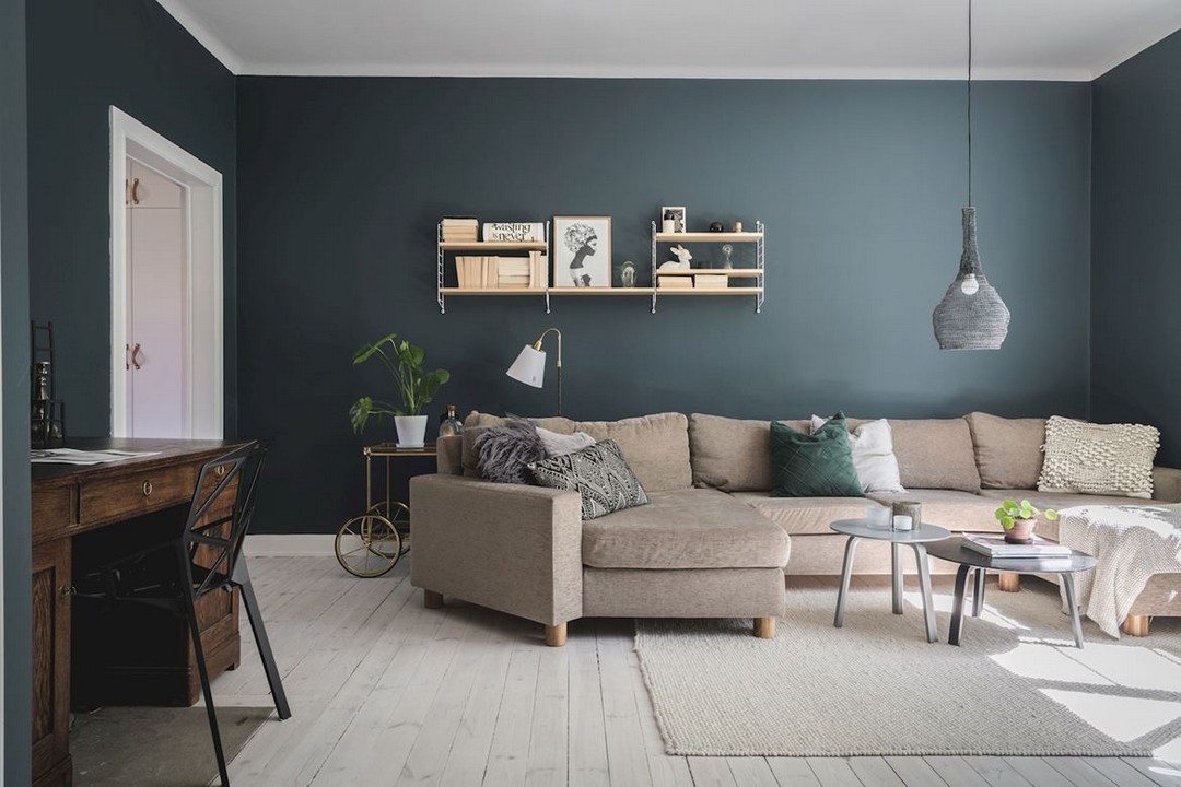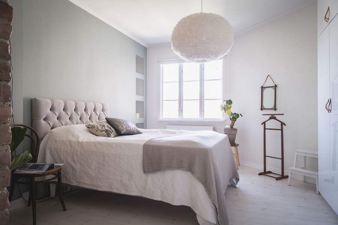Des personnalités assez différentes pour chaque pièce… une salle à manger très claires aux touches nature, un salon chaleureux aux murs foncés et une chambre qui allie briques et couleurs tendres.