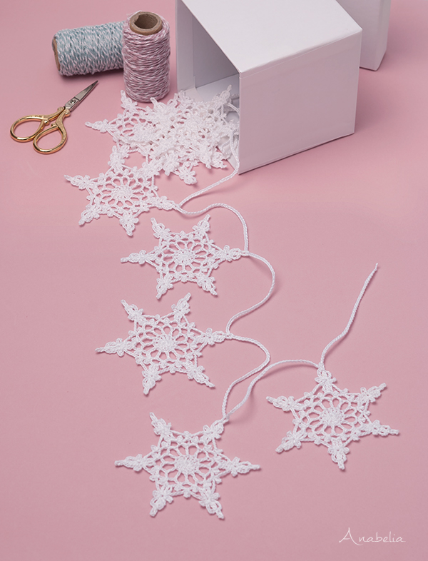 So now I’ve only changed the material: I make them of yarn. Yes, because these garlands are worth to decorate everything and can be made in any length so they fit well on any need: windows, on the fireplace and, if one is very, very encouraged, a whole Christmas Tree only decorated with these snowflakes, why not? ?