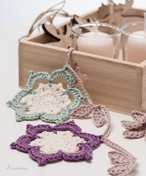 So I thought it would be nice to make stars in soft colors, really easy to crochet. The pattern is very simple: only 4 rounds crochet stars joined in a strip of small fall leaves which gives a nice rustic appearance to the whole.