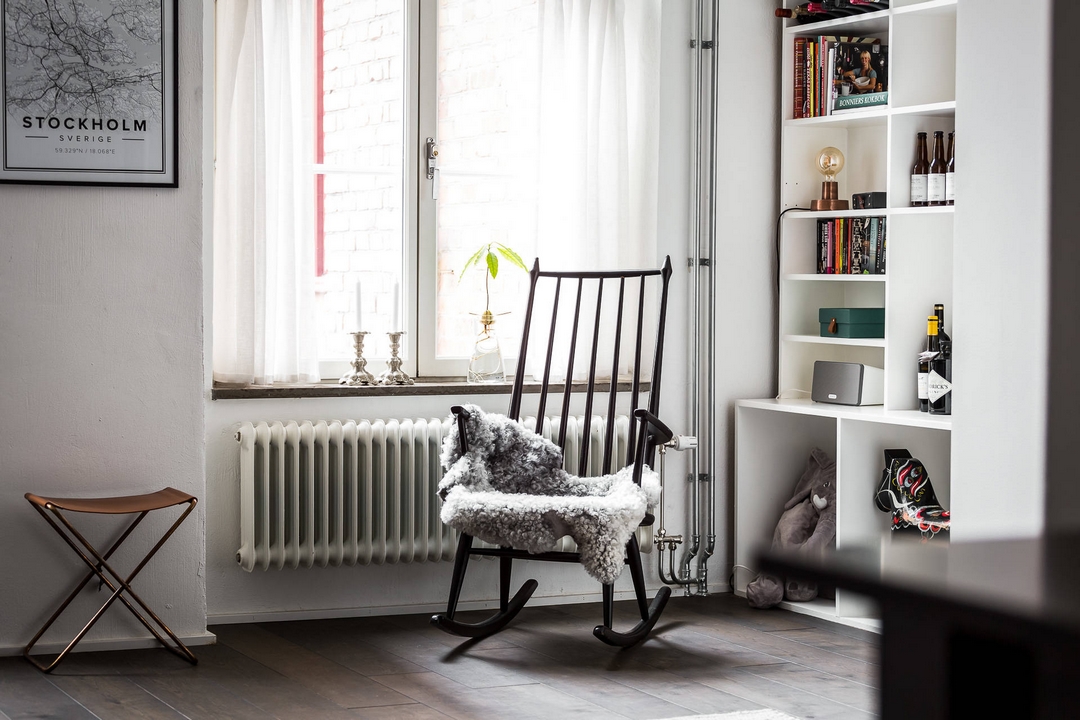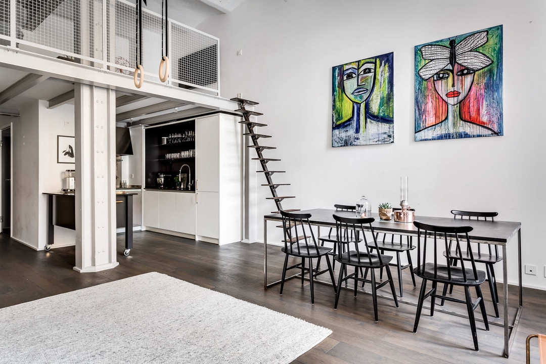 Une haute bibliothèque qui tire partie, et souligne aussi, la belle hauteur sous-plafond de ce loft.