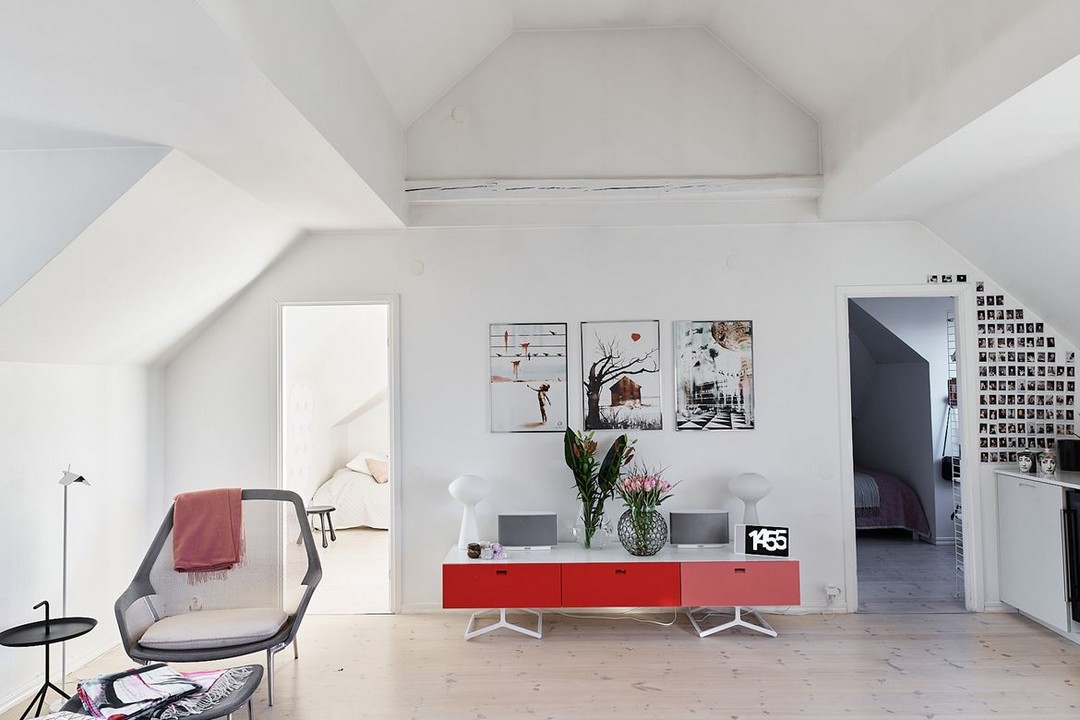 Situé sous les toits, cet appartement a choisi des lignes sobres avec des pièces design pour un effet impeccablement net.