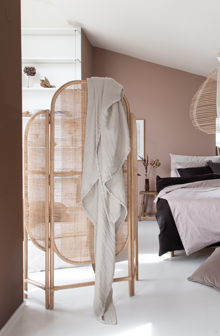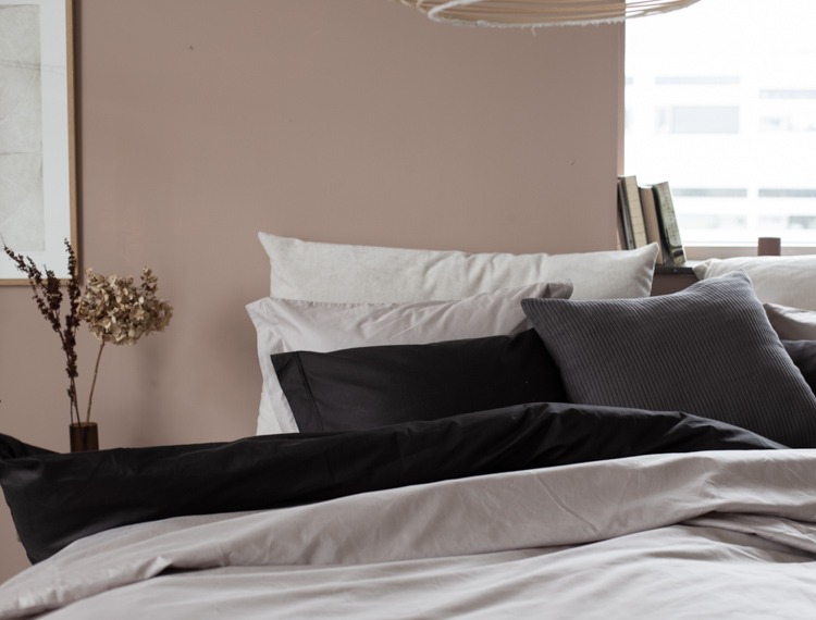 Our bed is layered with duvet covers in clay and soil and a mountain of cosy pillows in clay, soil and cotton rib stone.