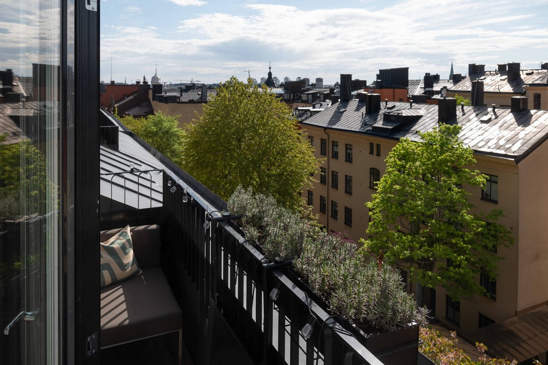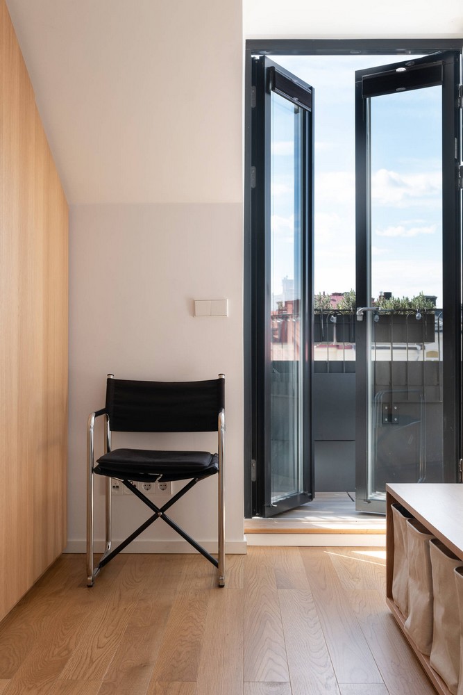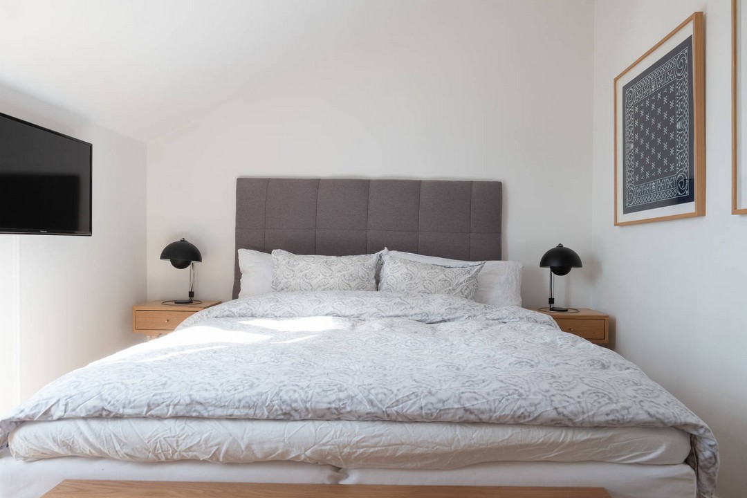 Ambiance bien masculine sur ces murs blancs, un ameublement foncé avec du bois de diverses teintes.
