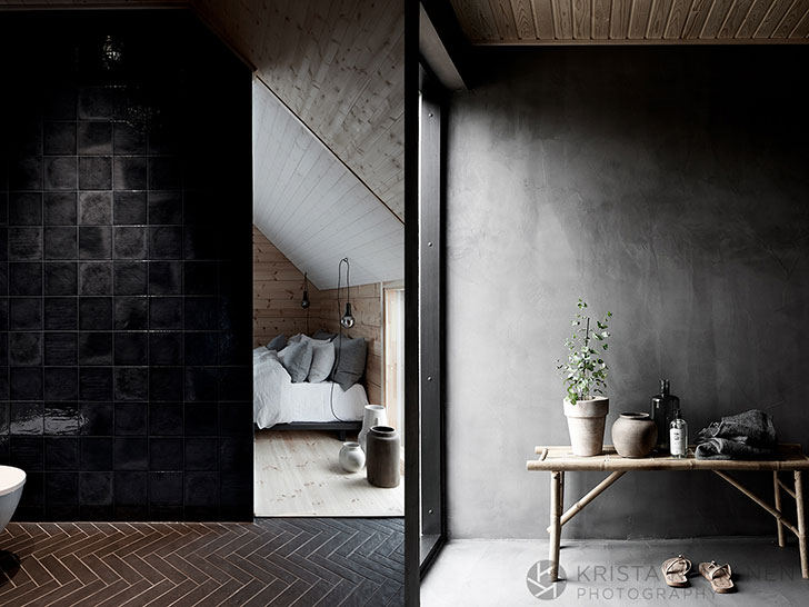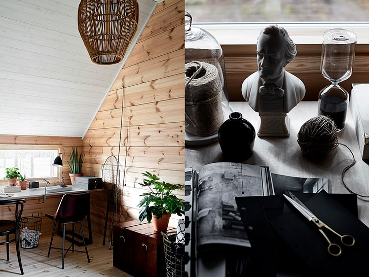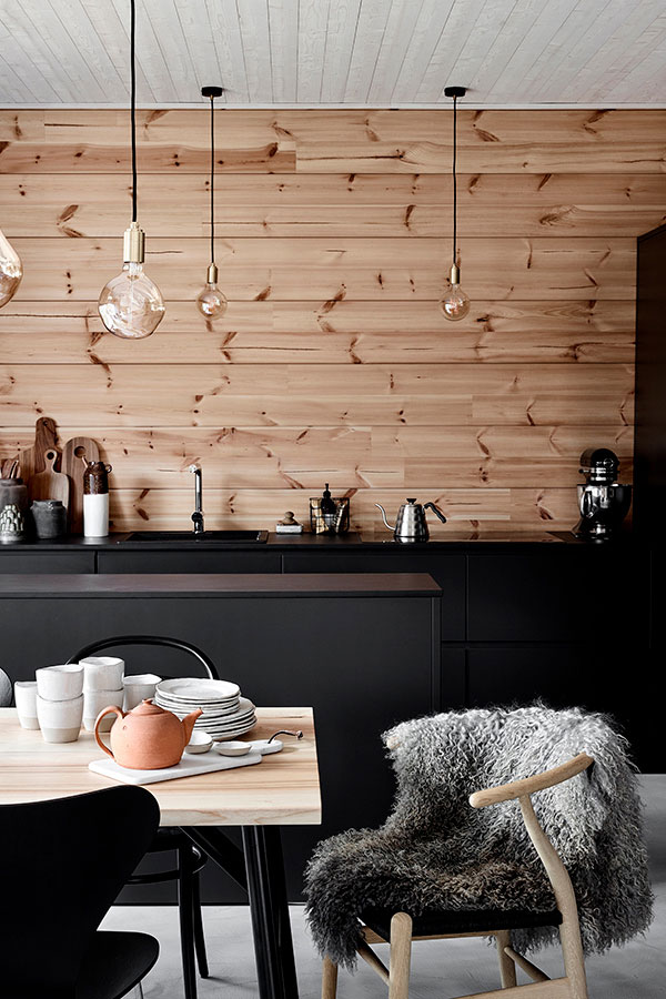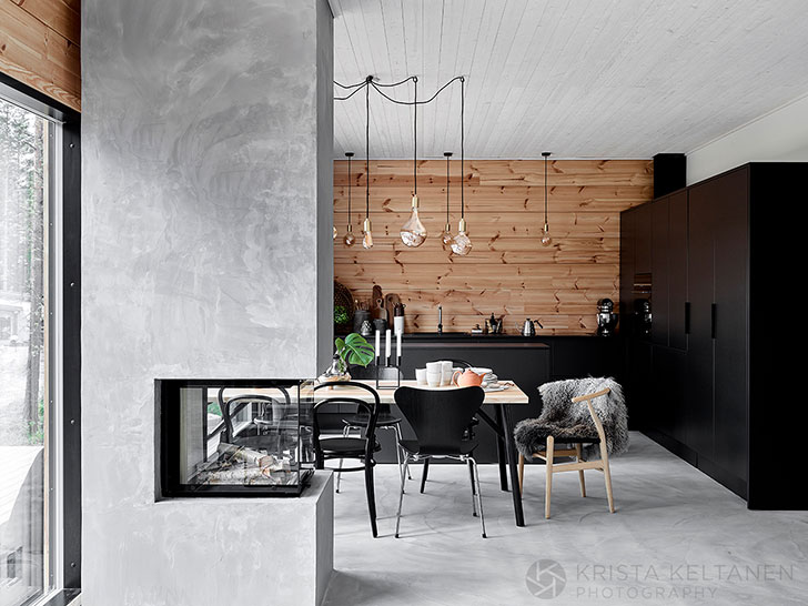 A cozy modern wooden house in Finland in gray, black and white with raw industrial elements mixed with natural wooden surfaces.
