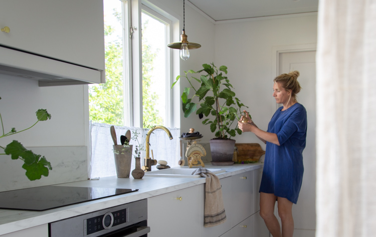 I think this area is my favourite. Since the house is quite old, the window height isn’t standardised, so we hung a linen curtain (which my Mother-in-law found at a flea market) behind the sink to stop things falling down behind the countertop and add a hint of traditional Swedish cottage style. The sink is the porcelain Havsen from IKEA and the tap – which I LOVE – is by Tapwell (see the get the look below). The latter was a little bit more of an investment, but I completely fell in love with the rich patina and love the feel of it when in use – and am so happy I went all out with the it.