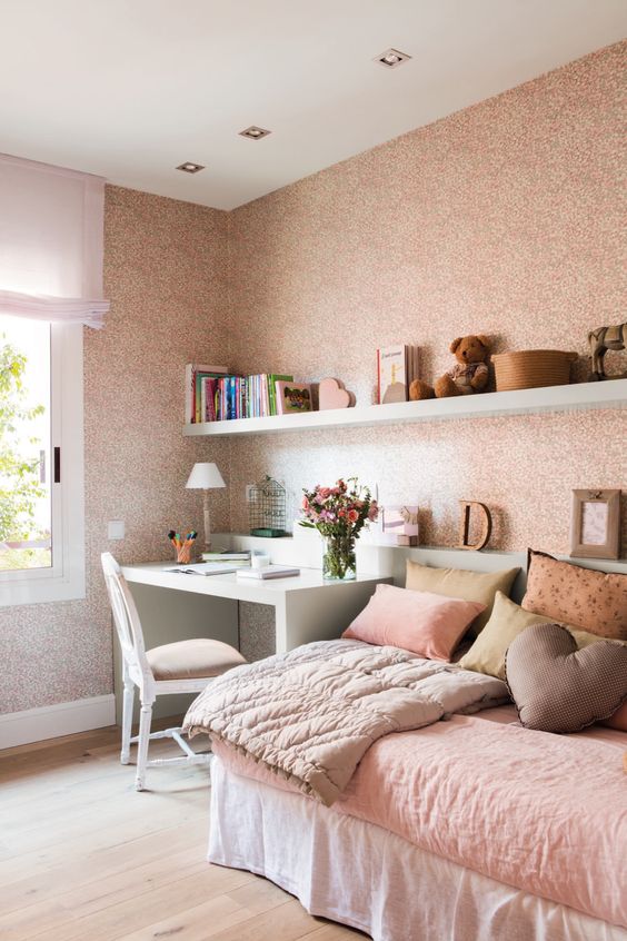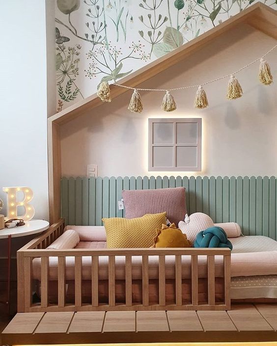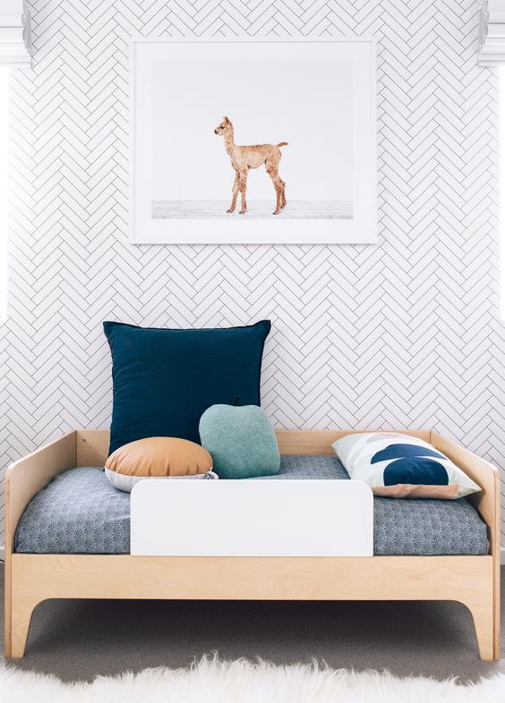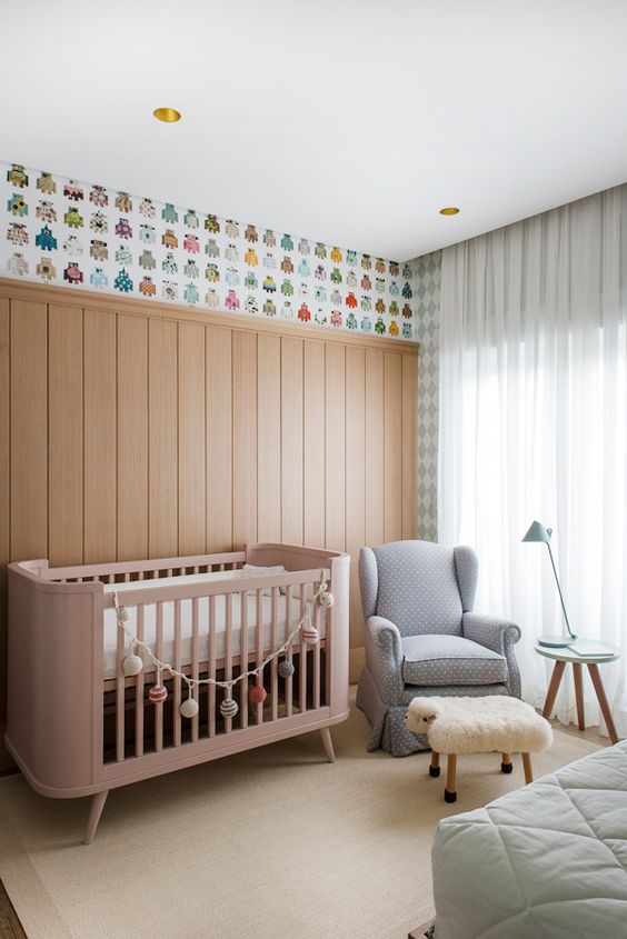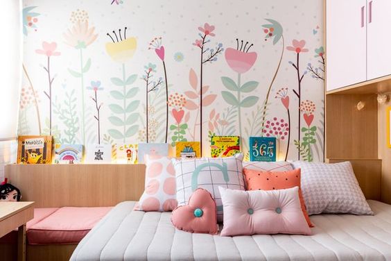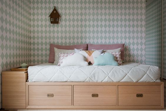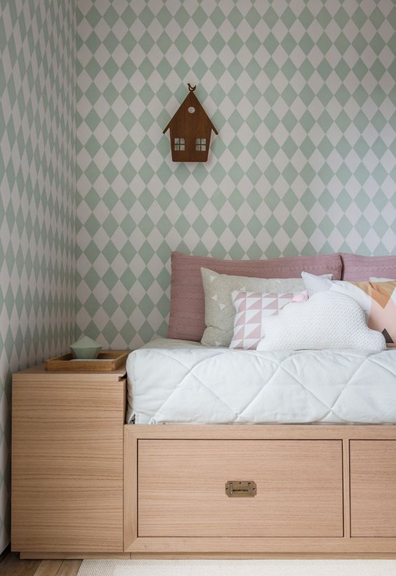 Tecidos e papéis de parede em estampas diferentes compõe lindamente com a madeira, neste caso um quarto colorido e, assim como os outros, suave ao mesmo tempo.