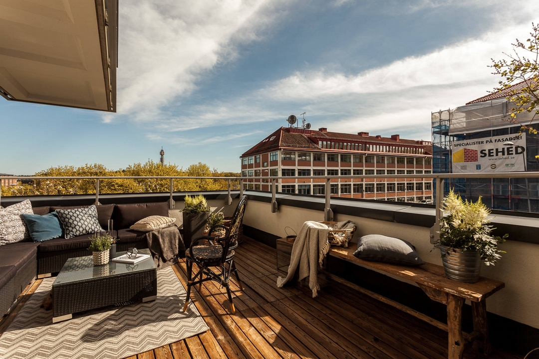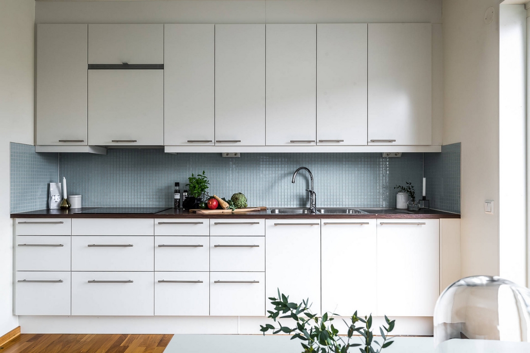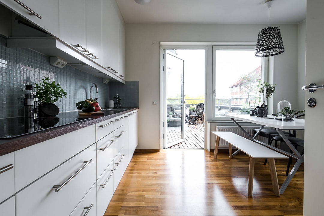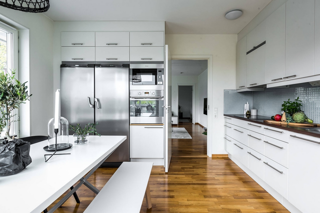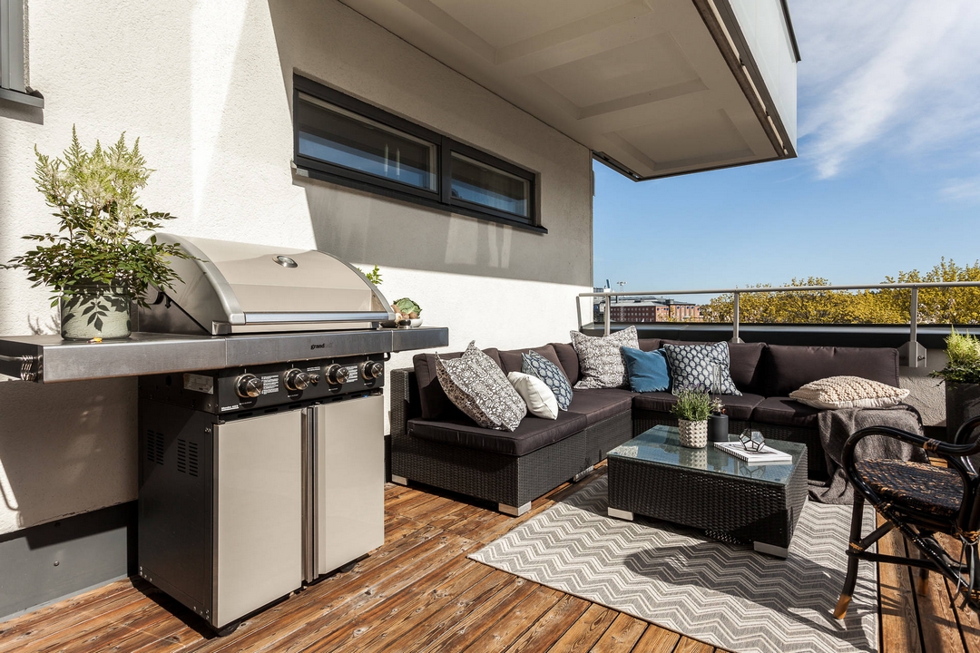 De lumineuses pièces avec trois larges ouverture pour le salon comme pour la cuisine. Cette dernière s’ouvre sur une belle terrasse, bien placée pour quelques préparations au barbecue.