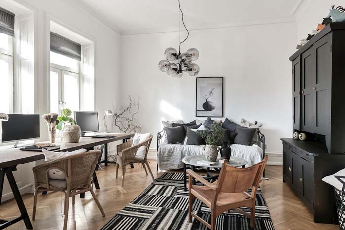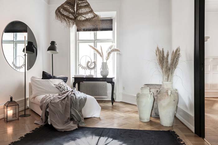 Tämän päivän kodeissa ensimmäisen kodin boho-henkiset yksityiskohdat, varsinkin ruokailutilassa ja pienessä välitilassa, eivät ehkä ole kaikkein onnistuneimpia ratkaisuja. Ruokailutilan sisustus on aikamoista sillisalaattia ja sopisi paremmin terassille kuin tuohon kauniiseen tilaan ja välitilan sisustus on kuin näyteikkunasta.