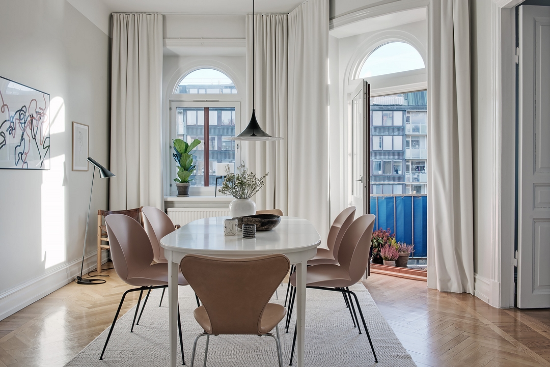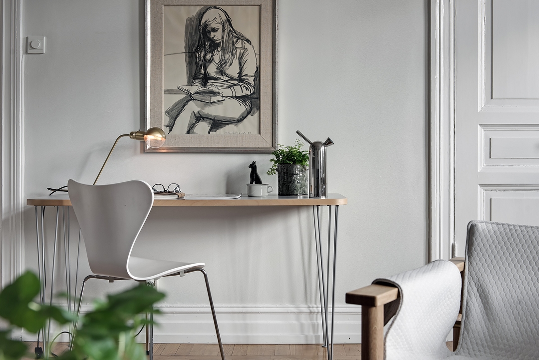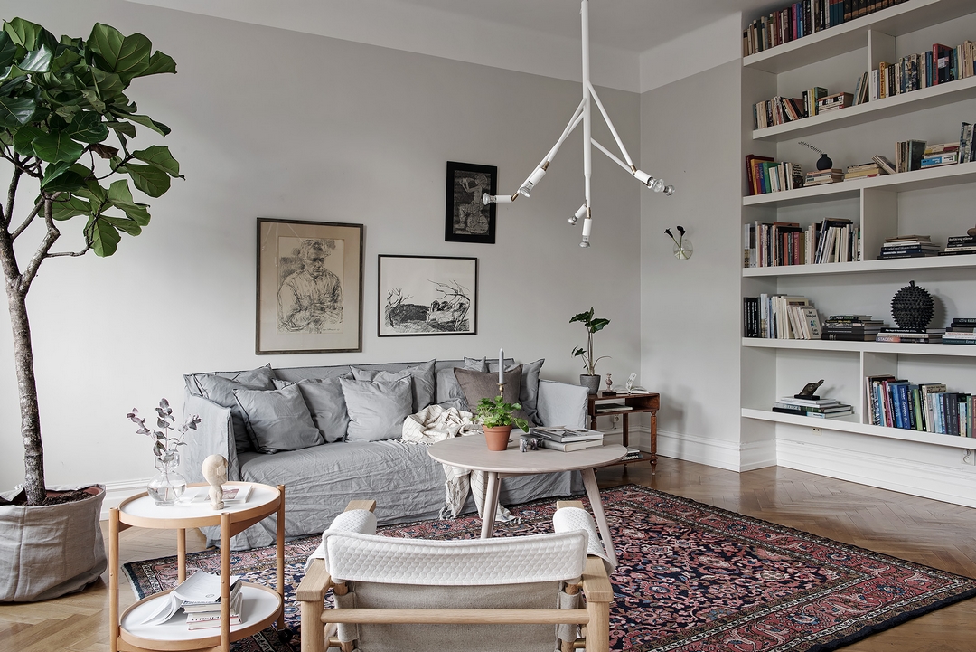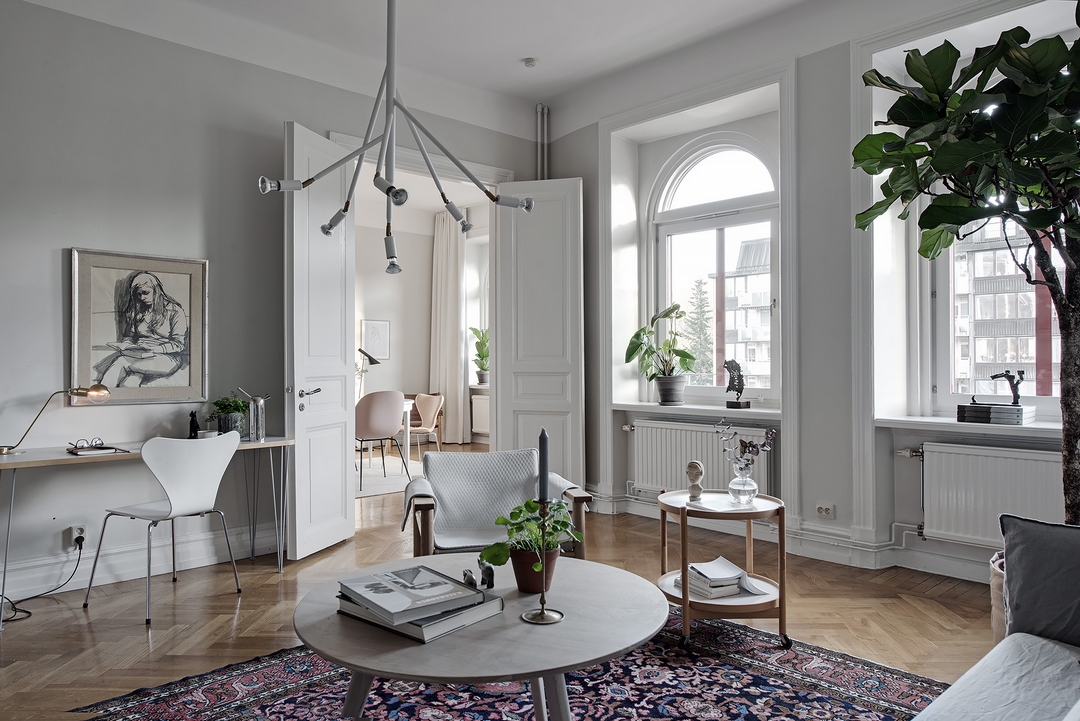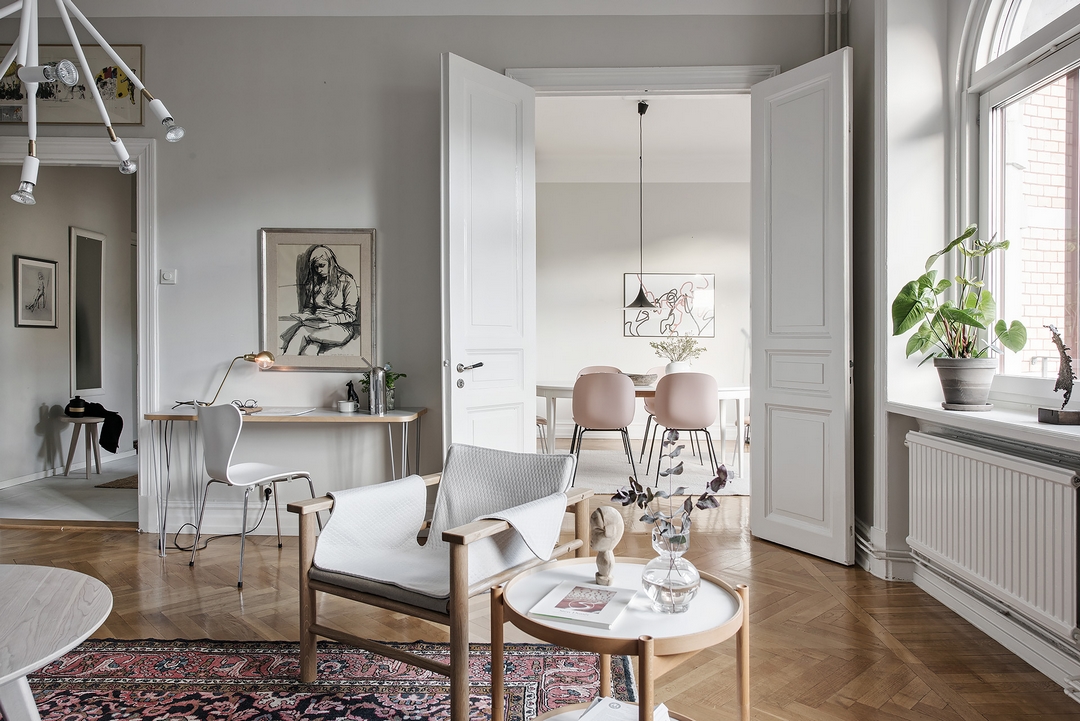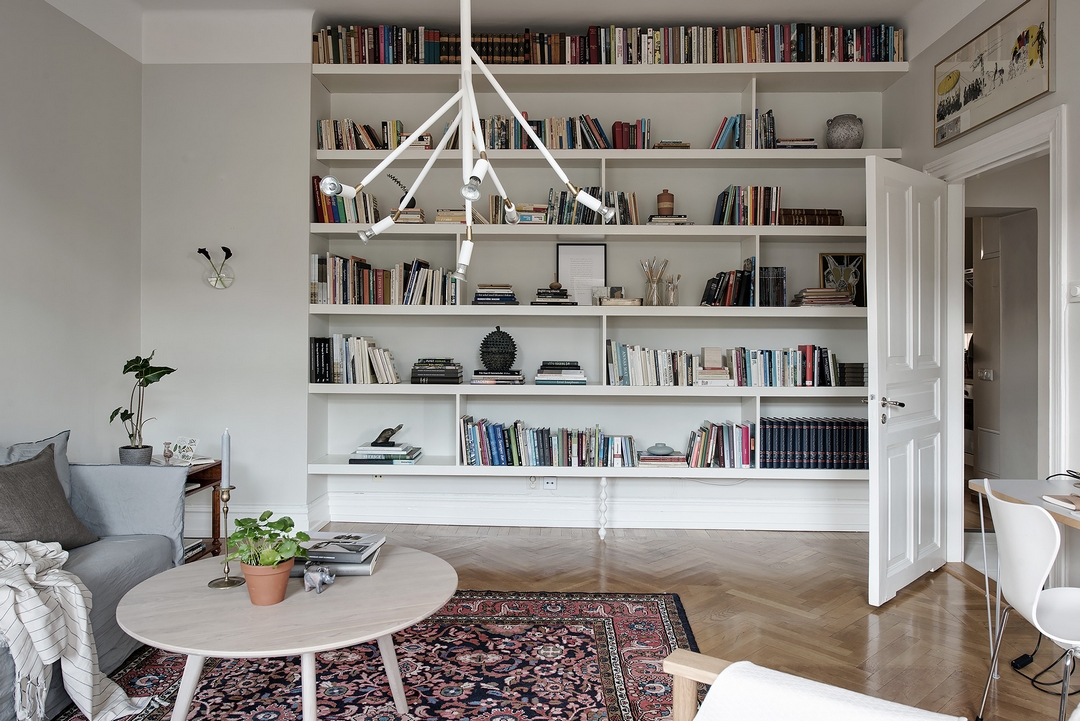 Faisons le tour de ce salon et vous apprécierez qu’il y ait de douces couleurs, un bureau, une bibliothèque et pour parachever, une double porte qui s’ouvre sur une salle à manger… vraiment parfait.