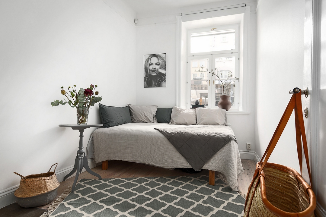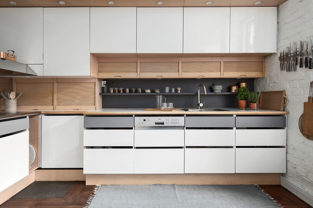 Tout en contraste sur les murs de briques blanchies, voici une cuisine originale avec ses rangements supplémentaires sous les éléments hauts et ses quatre couleurs, blanc, bois clair, gris foncé et gris clair.